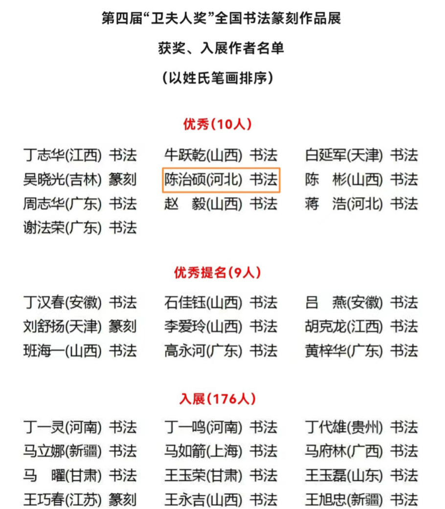 文学院书法学专业学生陈治硕荣获第四届“卫夫人奖” 全国书法篆刻展优秀作品奖