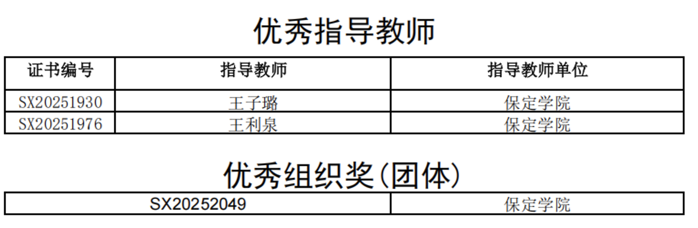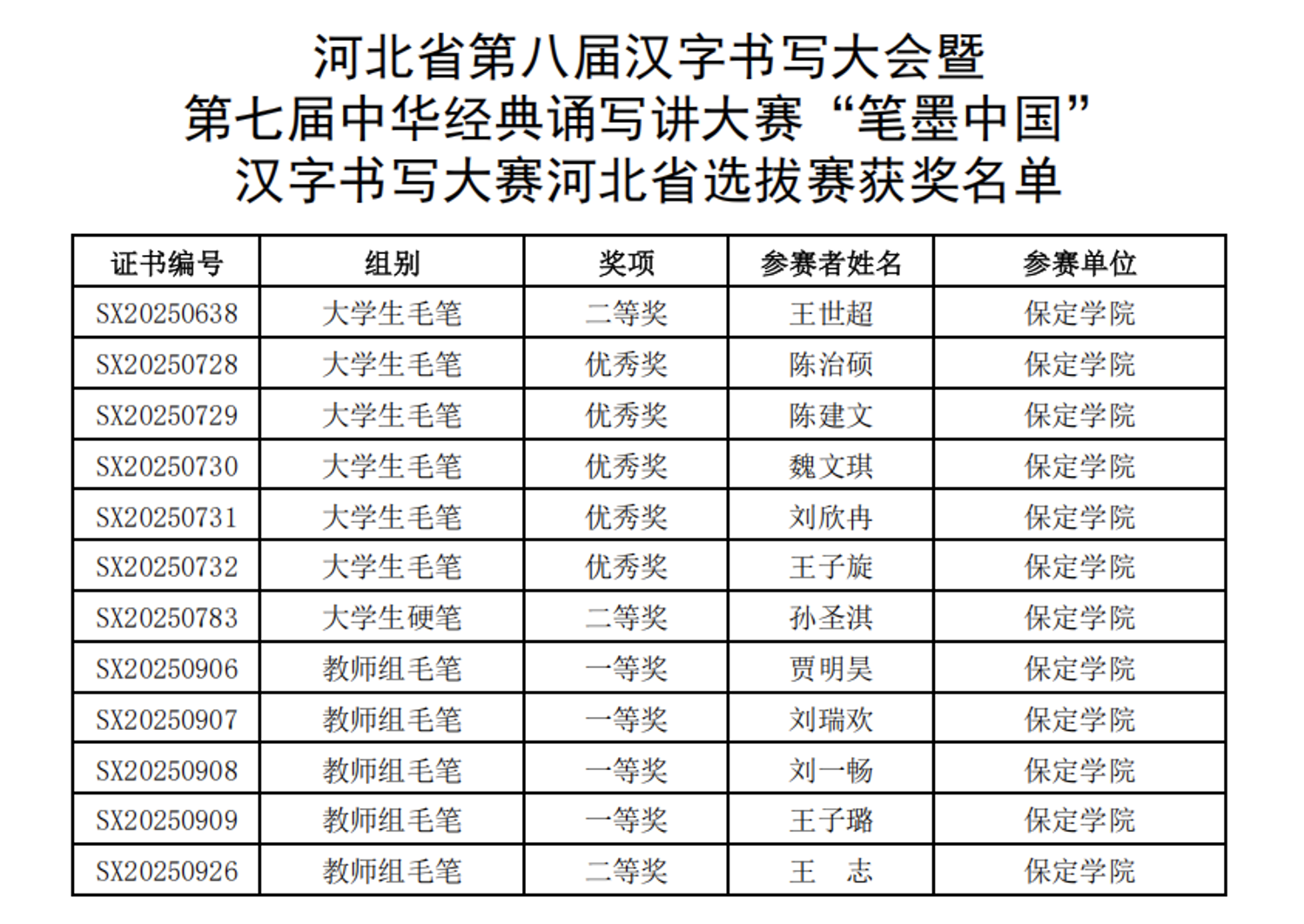 近日,河北省教育厅公布了河北省第八届汉字书写大会暨第七届中华经典诵写讲大赛“笔墨中国”汉字书写大赛河北省选拔赛获奖名单。在这次比赛中,文学院师生喜获佳绩,共获得省级奖项14项,其中一等奖4项、二等奖3项、优秀奖5项、优秀指导教师奖2项。保定学院荣获优秀组织奖。