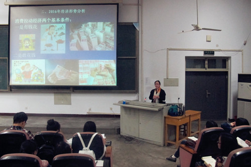 2016年4月14日,综合素质大课堂第245期如期进行。思政部于爱英教授做了《经济连着你我他——2016年中国经济形势分析》的专题讲座。于老师就2016年经济发展趋势、2016年经济形势分析以及面对经济形势我们应该怎么做等问题,用大量的数据、图片和案例,进行了详细解读,使同学们增加了经济知识,对创新创业的形势及突破点有了更加明确的认识。同学们纷纷表示听了于老师的讲座收获很大。