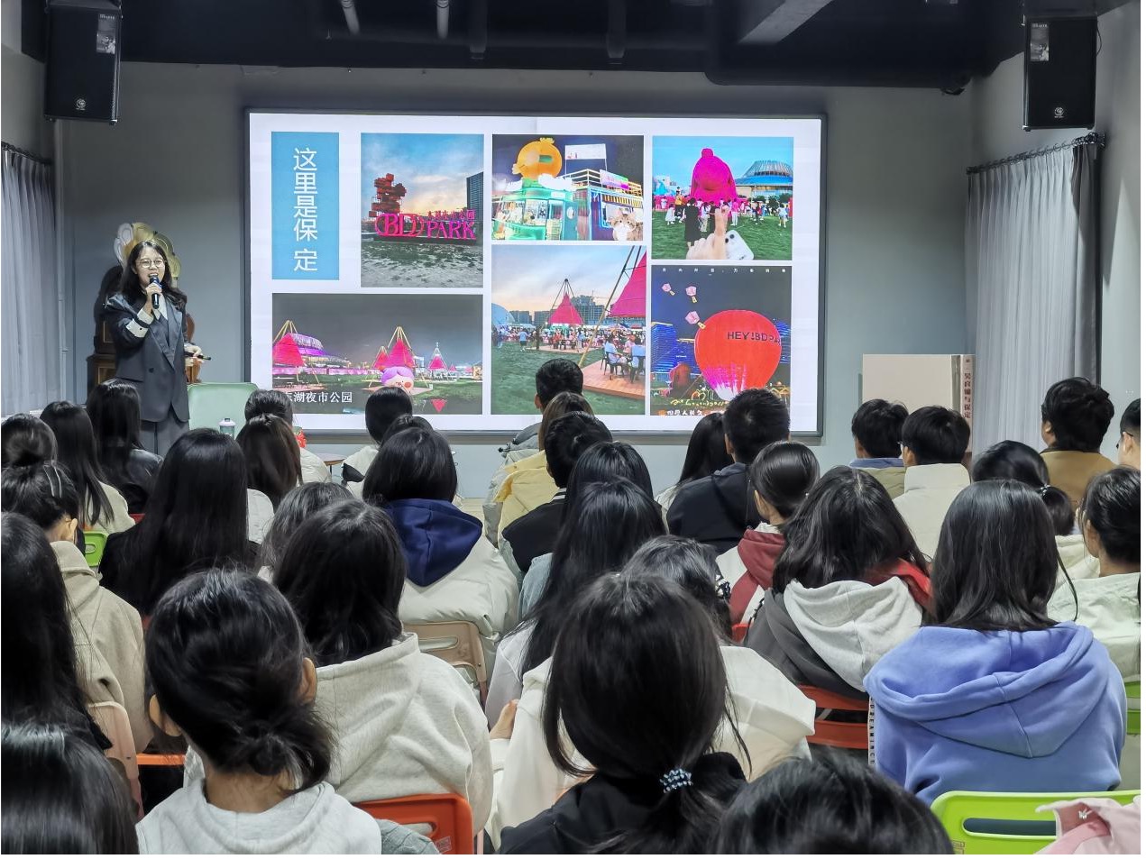 11月10日上午,我院教师宋铖铖受邀在半亩方塘文化社区举办了题为“保定——宜居之城新美学”的公益讲座,讲座吸引了百余人前来听讲。宋铖铖从城市美学的主要研究内容讲起,重点介绍了保定市如何从城市生活之美、生产之美、文化之美三个方面全力打造宜居之城,讲座通过大量丰富的图片,展示保定市近年来新建和修缮的文化活动、休闲娱乐场所,生动直观地为在场的听众呈现出保定市作为文化古城的历史底蕴和崭新风貌。听众纷纷表示,通过此次讲座,不但了解了关于城市美学的知识,还启发了自己去积极探索日常生活中的美好风景。