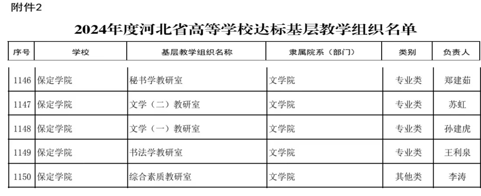 近日,河北省教育厅印发《关于公布2024年度河北省高等学校优秀和达标基层教学组织名单的通知》,我院共有5个教研室获批省级达标基层教学组织,分别是秘书学教研室、文学(一)教研室、文学(二)教研室、书法学教研室、综合素质教研室。
