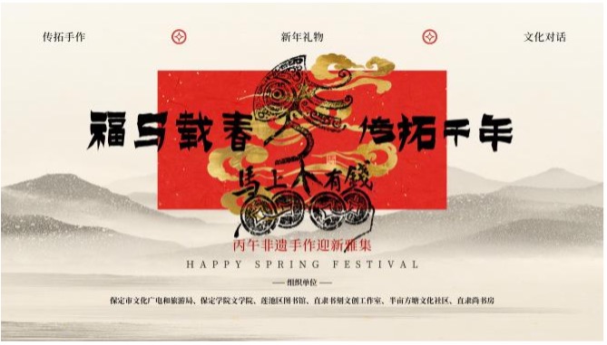 2026年2月8日,“传拓千年——丙午非遗手作迎新雅集”在半亩方塘文化社区举办。本次活动由保定市文化广电和旅游局、保定学院文学院、莲池区图书馆等单位联合主办。我院直隶书刻文创工作室师生携自主设计与雕刻的系列“马年”主题作品,吸引了众多市民驻足体验。